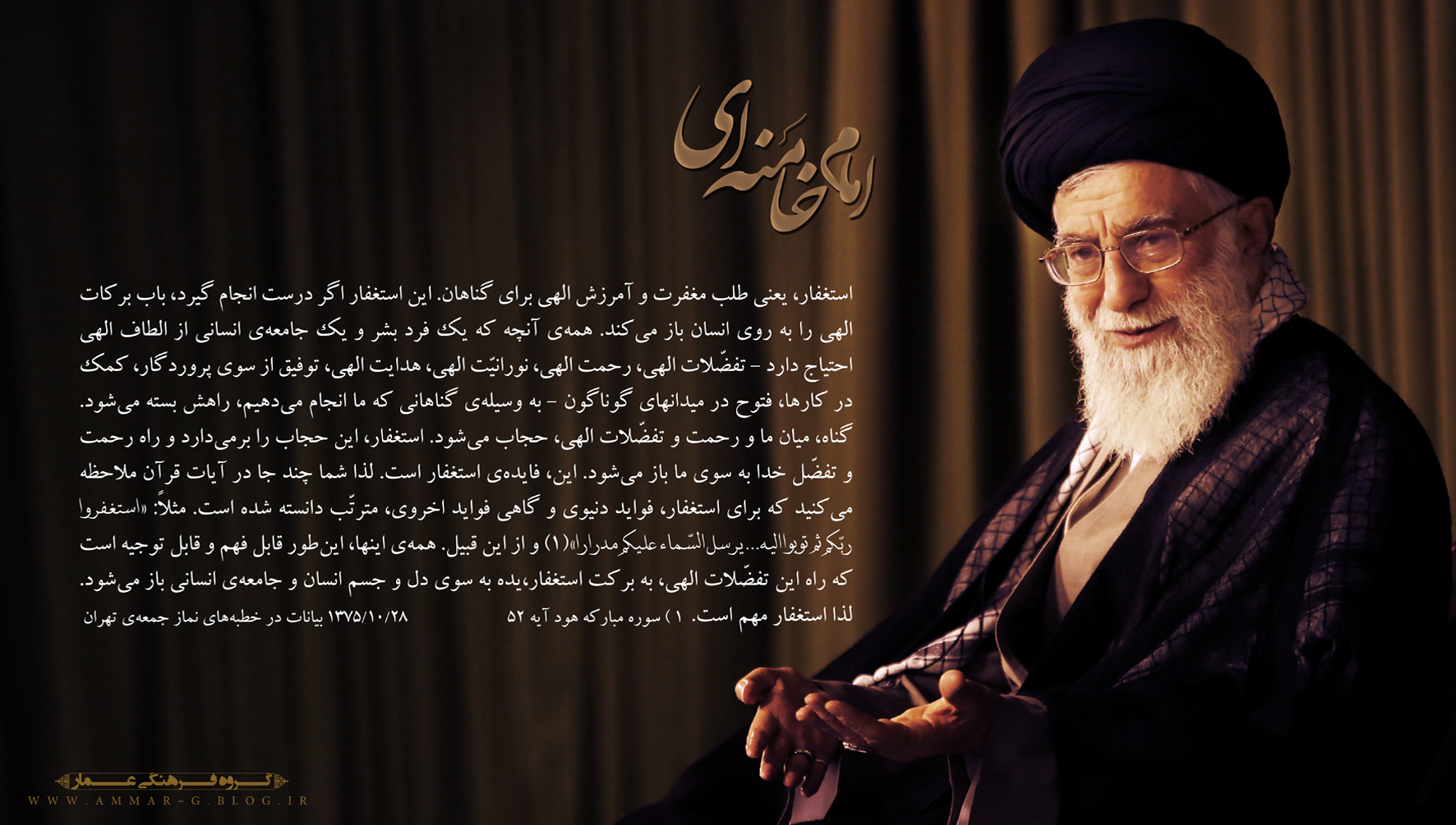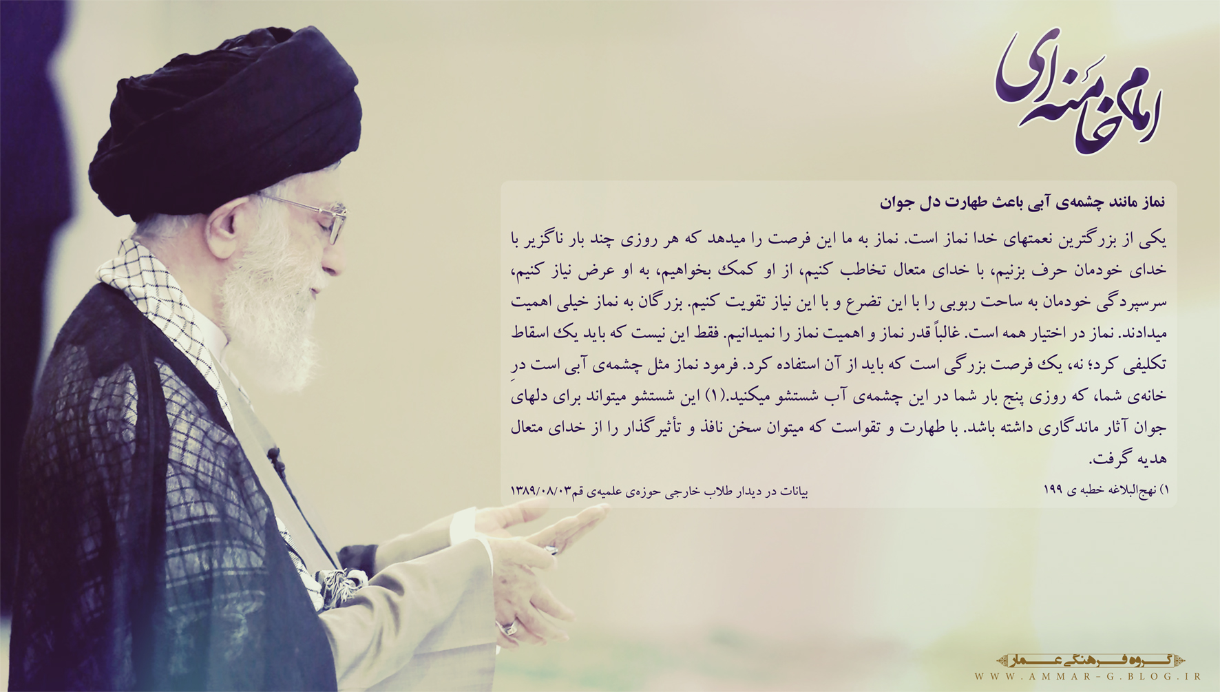 حضرت آیتالله خامنهای: «عزیزان! بسیاری از آنچه را ما دیده و آزمودهایم، نسل شما هنوز نیازموده است. ما دیدهایم و شما خواهید دید. دهههای آینده دهههای شما است و شمایید که باید از انقلاب خود حراست کنید و آن را هر چه بیشتر به آرمان بزرگش که ایجاد تمدّن نوین اسلامی و آمادگی برای طلوع خورشید ولایت عظمیٰ (ارواحنافداه) است، نزدیک کنید.» ۱۳۹۷/۱۱/۲۴